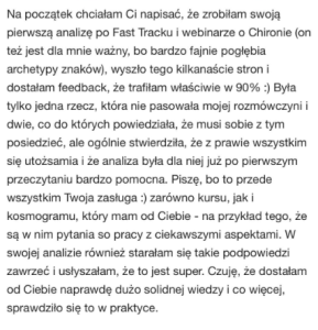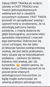 ,,Kurs bardzo dużo wniósł i pomógł mi przestać być zieloną, wiele kropek już umiem połączyć sama i czuje że dużo załapałam i wiem też dzięki Tobie jak kosmogramy interpretować po kolei i co jest najważniejsze.”